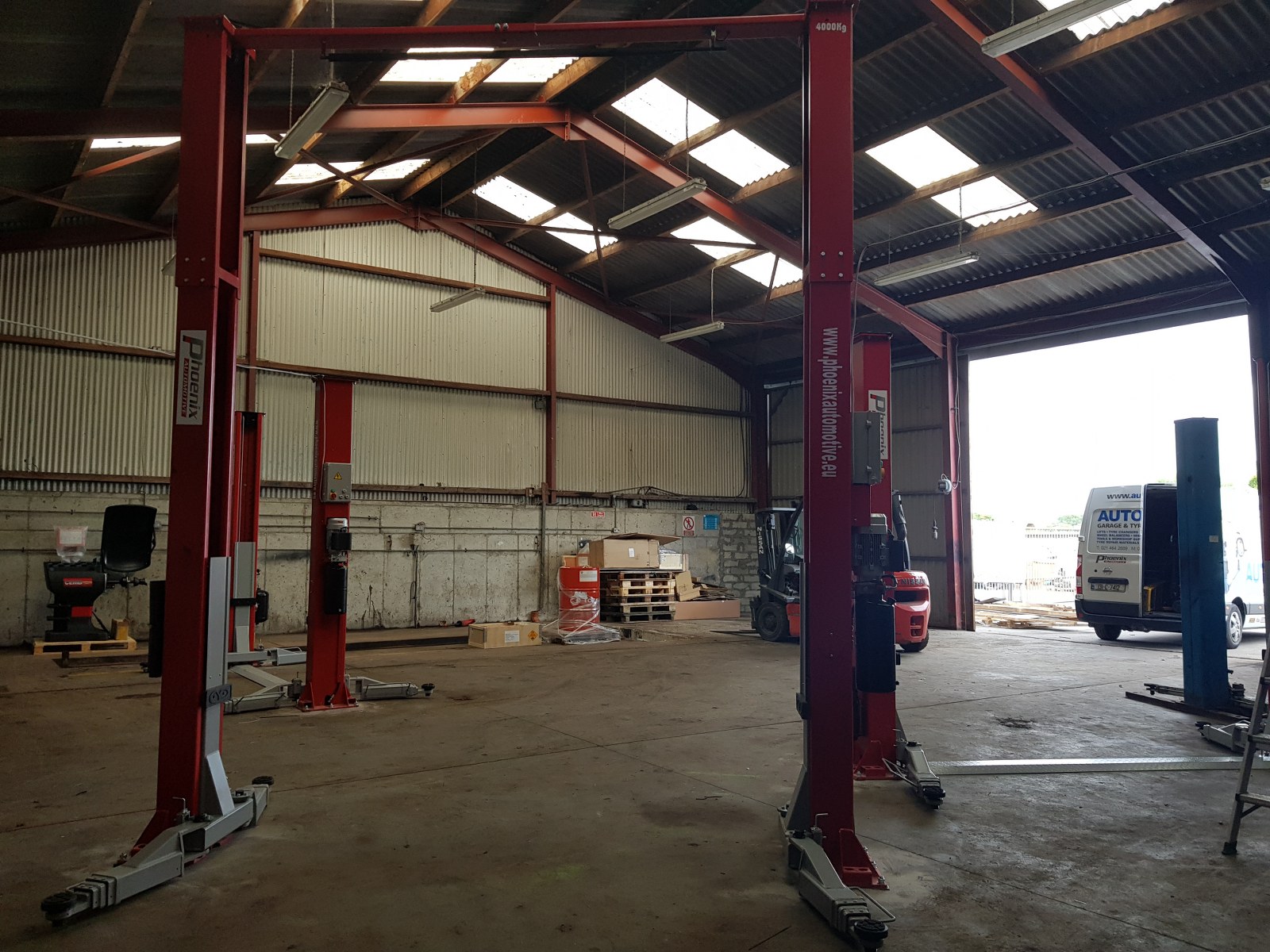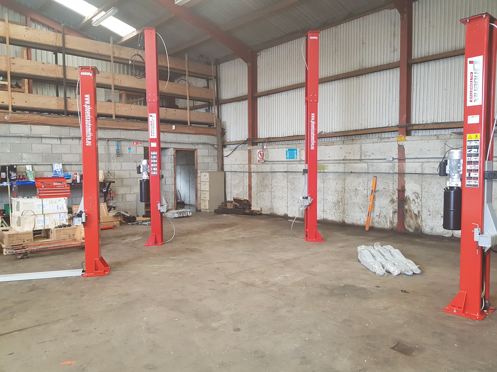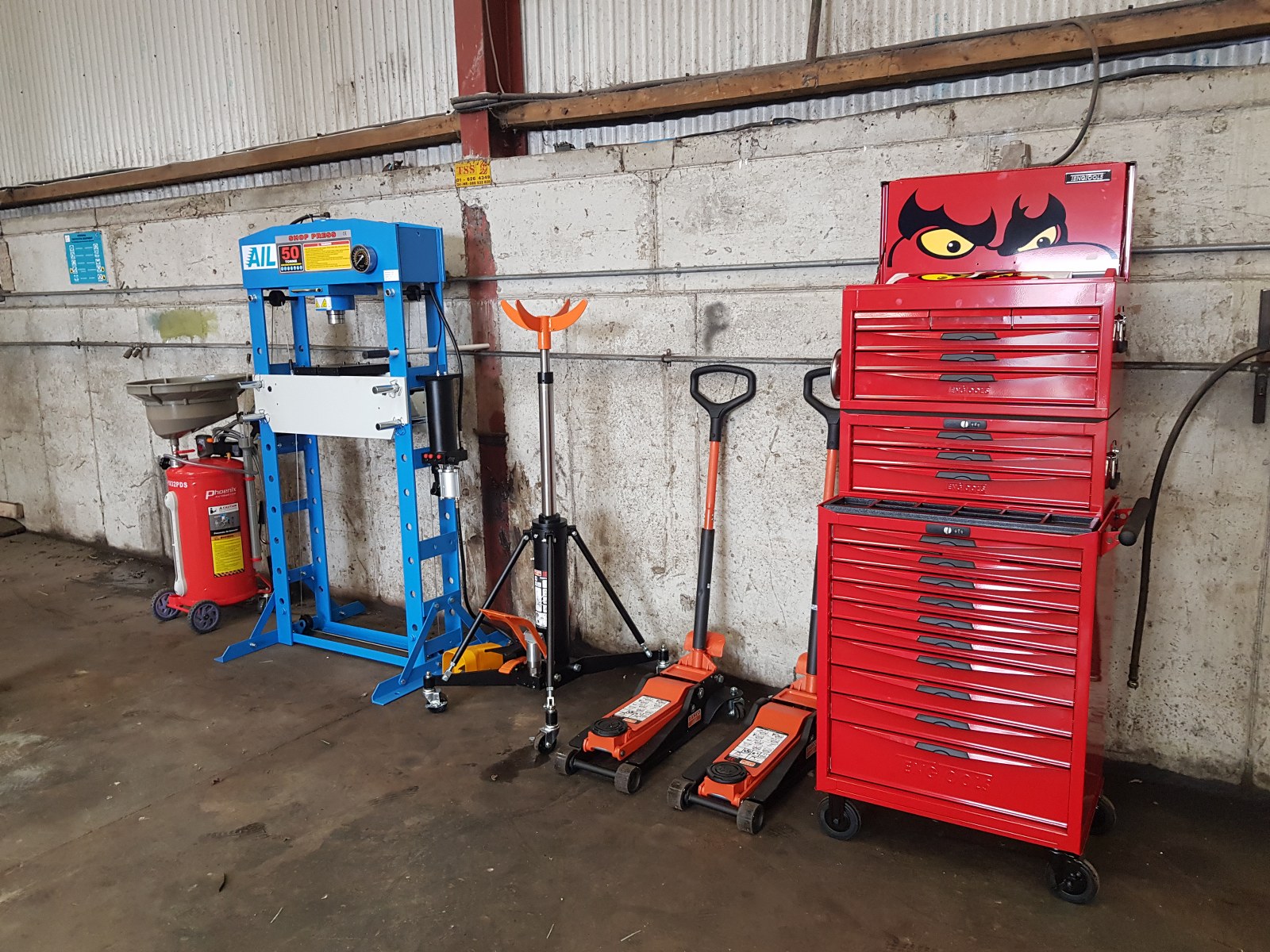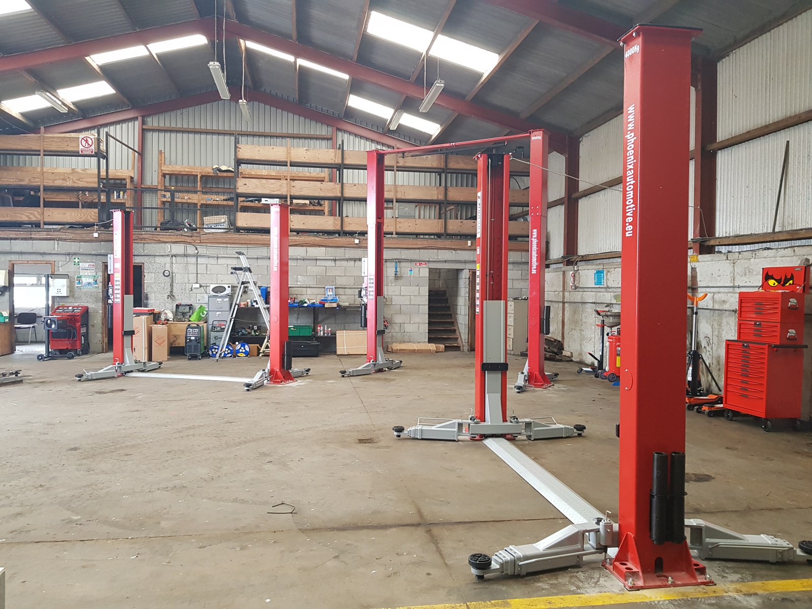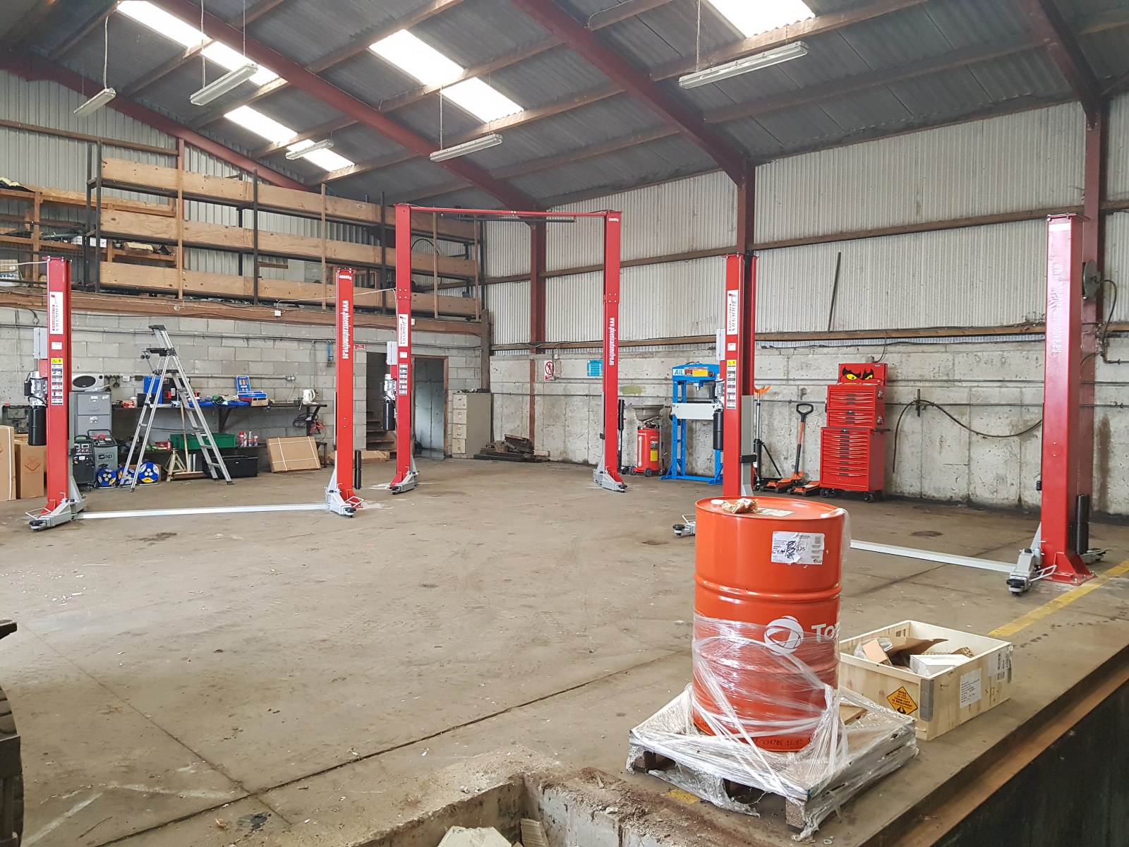 Install consisting of 2 x PA-6240TH 4 ton clear floor 2 post lifts, 1 x PA-6140D 4 ton 2 post lift, Cemb ER80 3D wheel balancer, PA-7226IT tyre changer and a selection of hydraulic tools and equipment, 50 ton press, Bahco trolley jacks, Teng Tools toolchest, oil drainers, Raasm products, welders, air lines and King Tony hand tools.