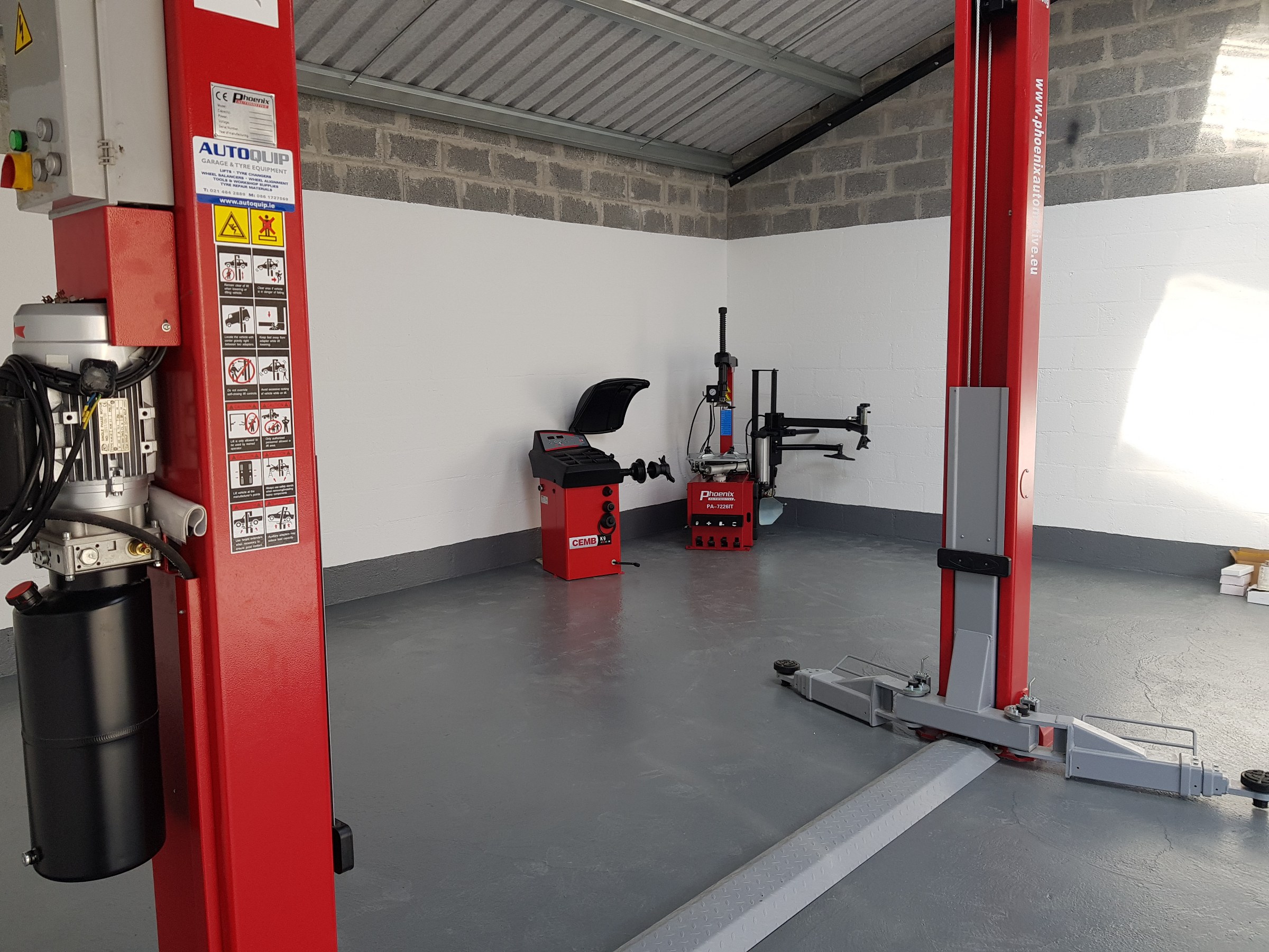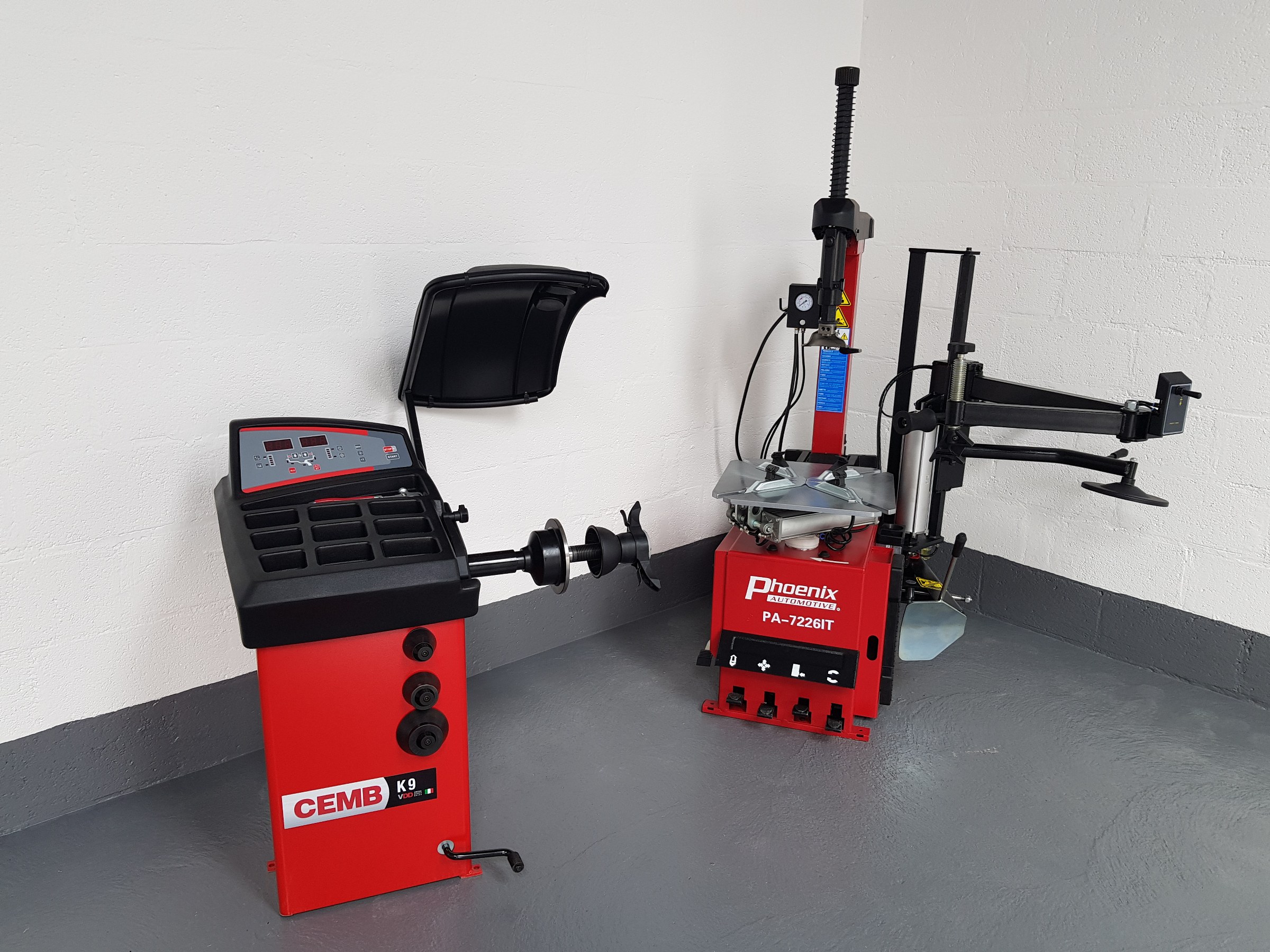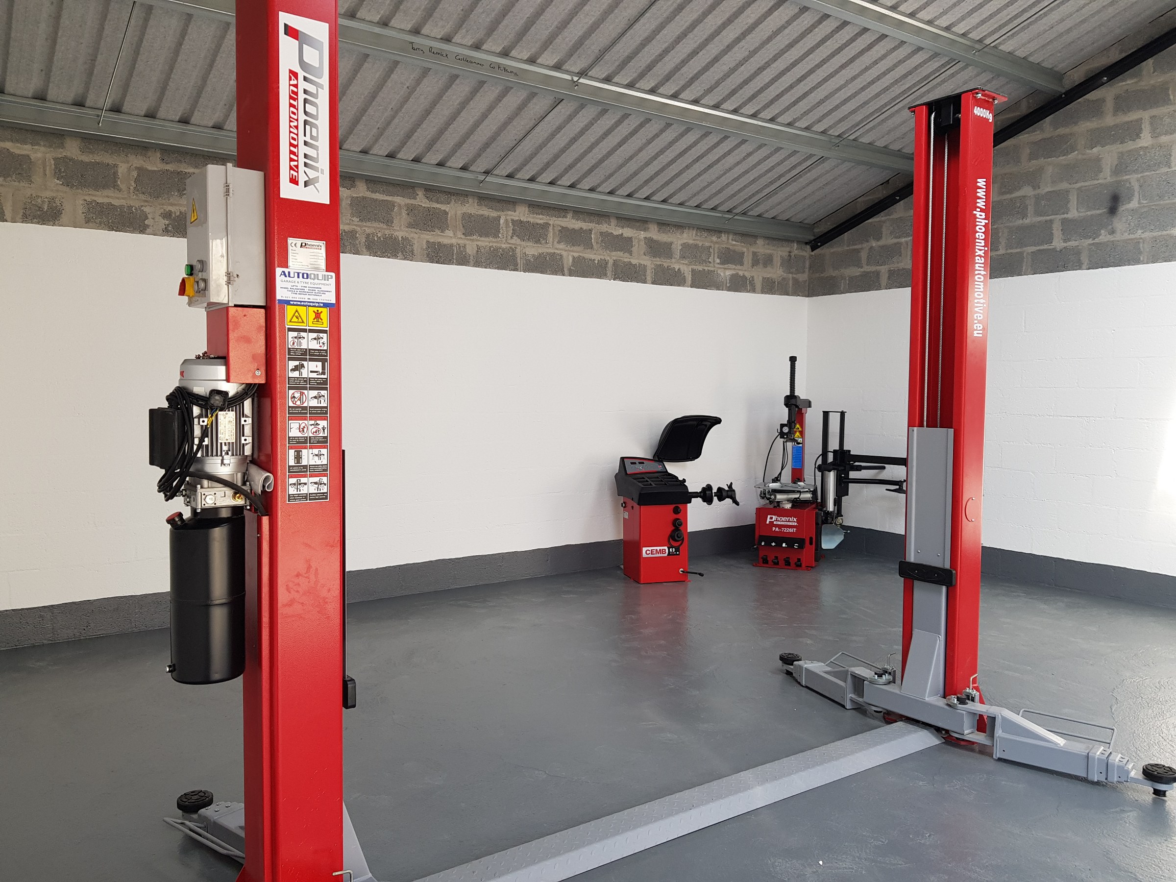 Cemb K9 semi automatic wheel balancer, Phoenix Automotive PA-7226IT tyre changer and a Phoenix Automotive PA-6140D 4 ton 2 post lift installed for Direct Auto Parts in Kilkenny.