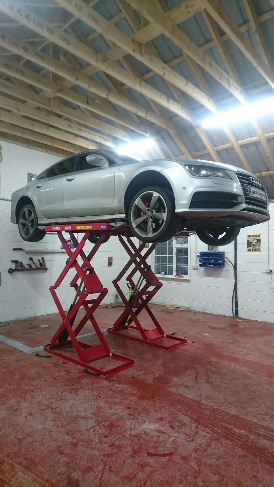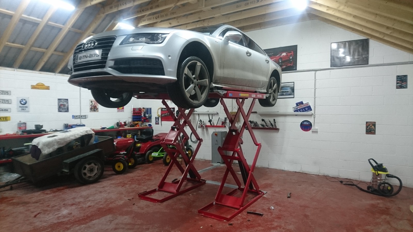 Phoenix Automotive PA-7230 3 ton on floor scissor lift installed in a private garage.
