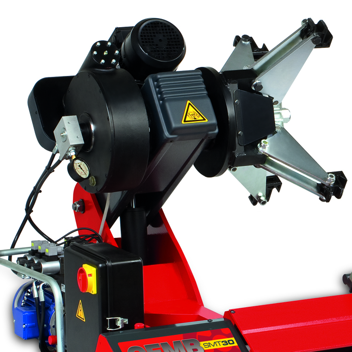 The hydraulic chuck has working capacity from 14” to 30” and itperforms a 1-speed rotation in both directions. The 4 self-centering clamps with adjustable pressure have been studied to allow several clamping solutions in order to assure a perfect locking of any rim’s shapes and profiles.